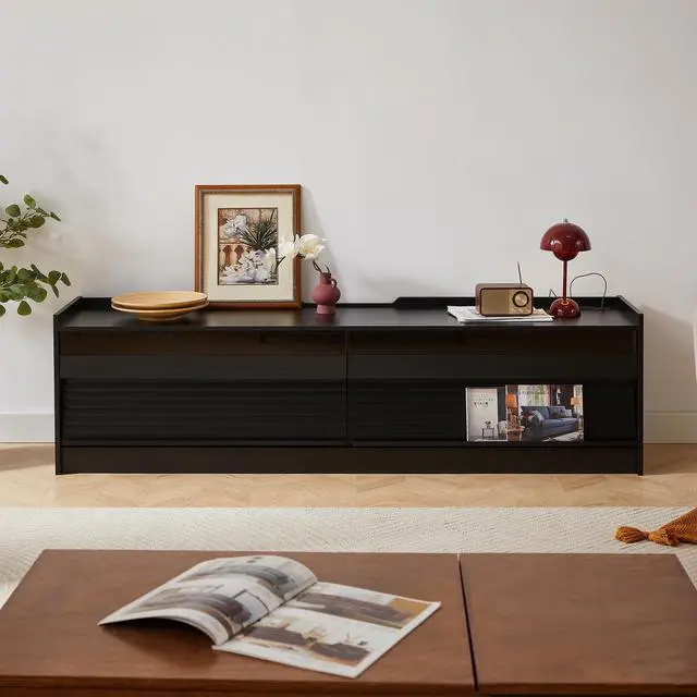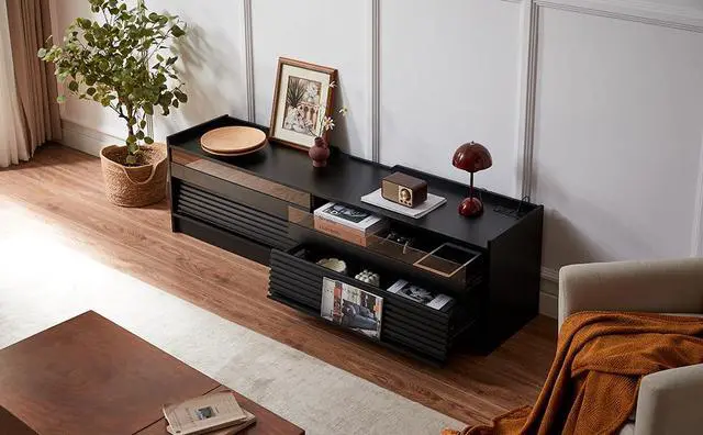 Four Drawers: This modern TV stand features four generous drawers, providing ample storage space for all your media essentials. The drawer fronts are crafted with tempered glass and a sleek horizontal stripe design, adding a touch of elegance while maintaining a minimalist aesthetic.