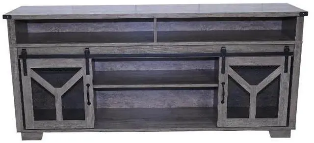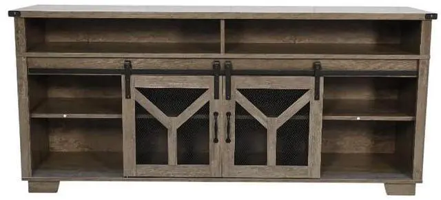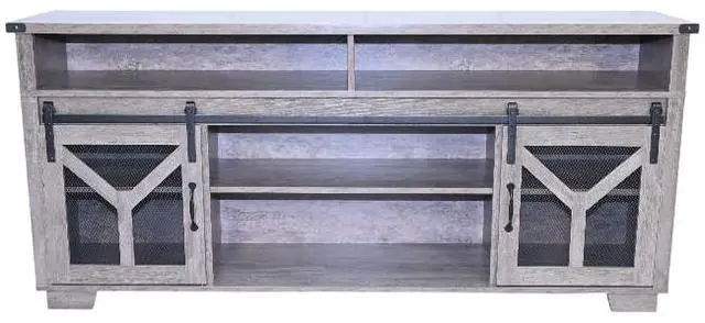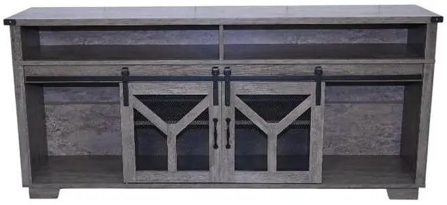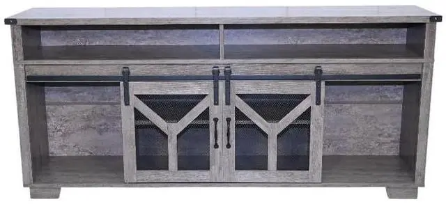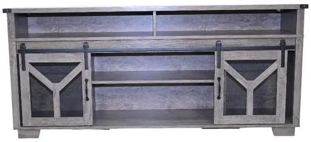 Unique Rustic AestheticThis TV stand is a perfect addition to any home with a penchant for country - style decor. The charming country gray finish exudes a warm and inviting atmosphere, instantly transforming your living space. Sliding barn doors with inset metal mesh and dark iron-tone hardware not only not only provide a practical storage solution but also add a touch of rustic elegance, reminiscent of classic barns in the countryside.