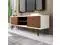 Functional entertainment center for living room constructed with kiln-dried solid wood with walnut color and white/walnut color.
