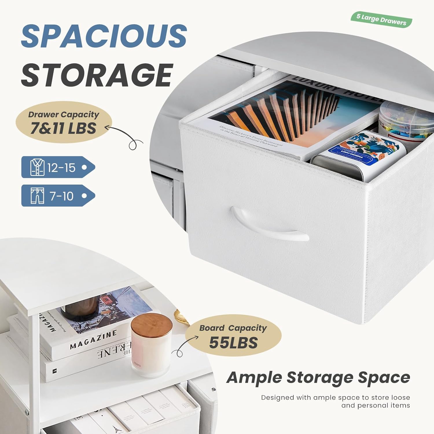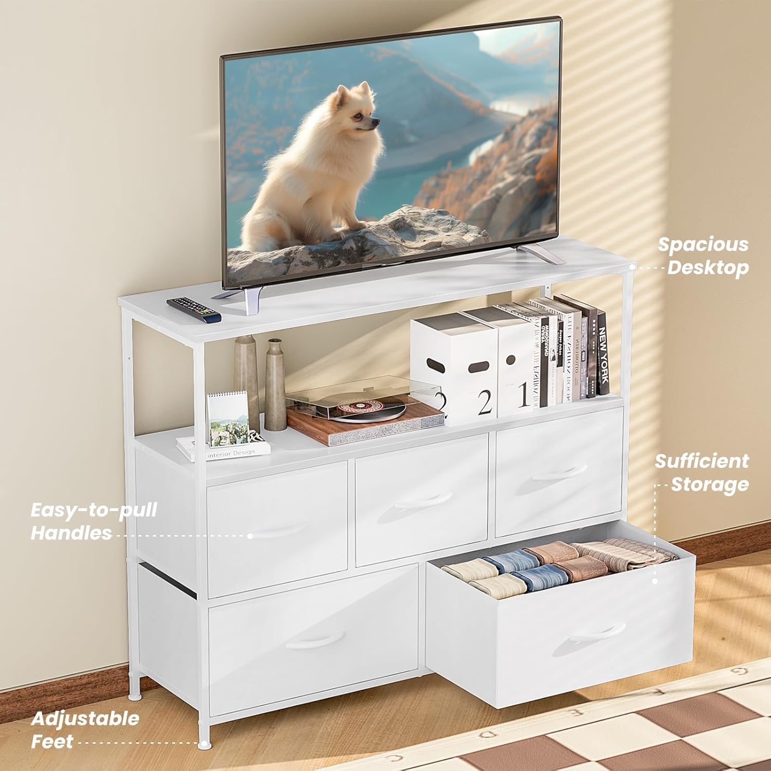 Eyesoul TV Stand Dresser with 5 Fabric Storage Drawers, Media Console Featuring Open Shelf for 45 inch TV, Compact Entertainment Unit for Bedroom, Living Space, or Dorm Organization, White