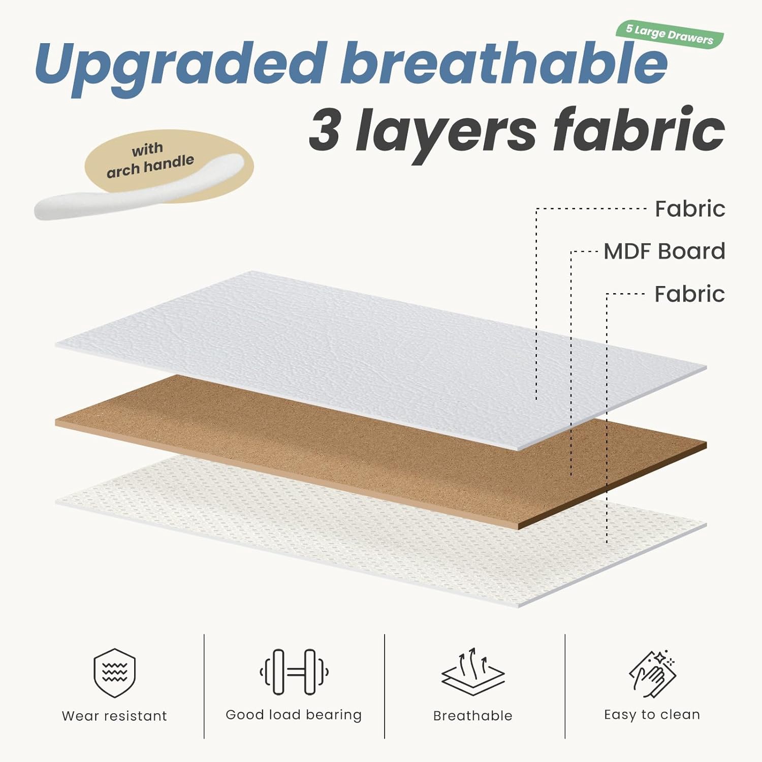 5-Drawer DresserThis fabric dresser comes with 5 removable drawers that offer ample storage capacity for organizing various items. The top drawer is perfect for storing frequently used belongings, while the lower drawers are ideal for keeping unused or infrequently used items neatly organized.