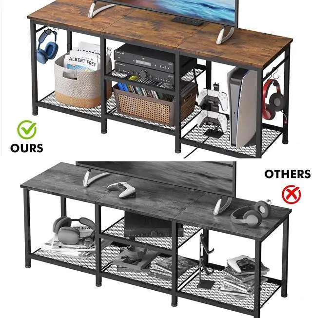 OPEN STORAGE SPACE: For easy cooling of your devices, so this TV stand is pure mesh shelf open space design with 2 tiers of open mesh shelves and 4 hooks, extra large storage space to show off your media devices, gaming consoles, DVDs, Xbox, PS5 and more. Creating a personal entertainment center.