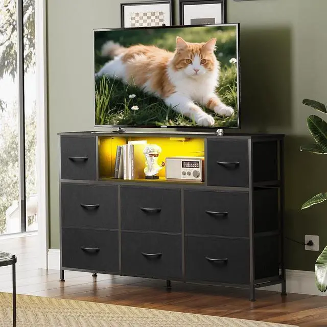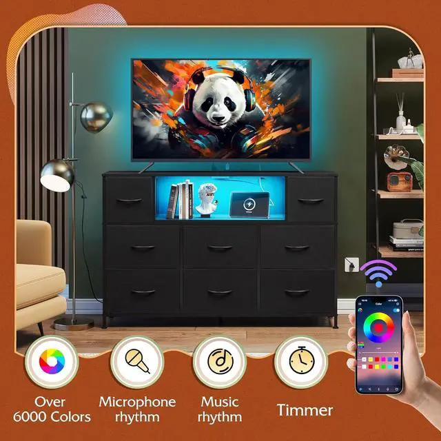 Eyesoul Black TV Stand for 45, 50, 55 inch TV, Entertainment Center with LED Lights & Charging Station, TV Media Console Table with 8 Fabric Drawers and Open Shelves for Living Room, Hallway, Wood Top