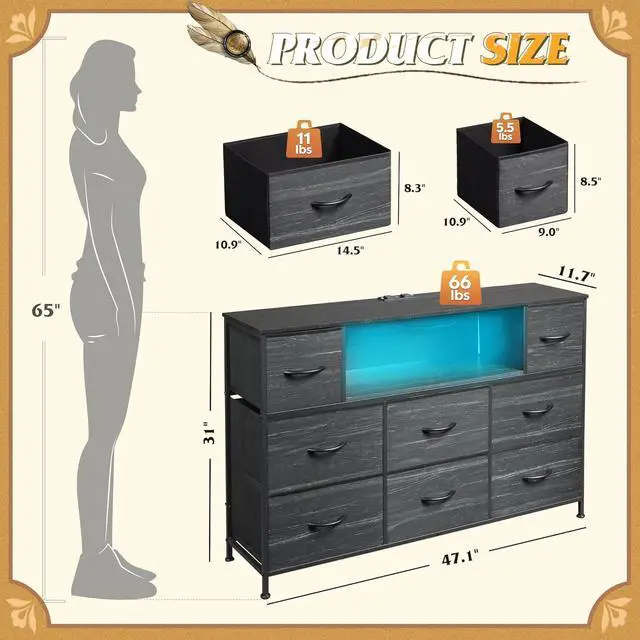Ample Storage TV StandMeasures 11.7"D x 47.2"W x 31"H, 55'' TV can be placed, our media console is equipped with 8 detachable fabric drawers and spacious woodtop, which facilitate the orderly storage of entertainment equipment and daily items, while the desktop provides display space for artworks and small ornaments, and more life style!