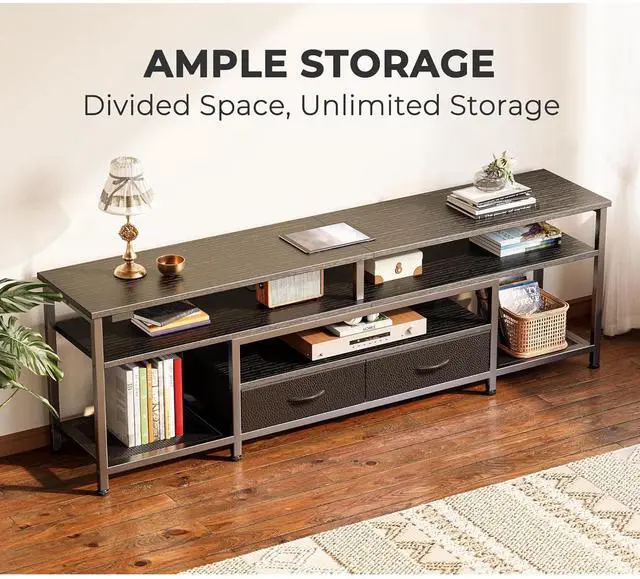 Storage from Shelves and DrawersOur black TV stand comes equipped with black PU leather fabric drawers, adding a touch of elegance. And 2 drawers are perfect for storing videotapes, books, chargers, remote controls while mesh and open shelves will arrange your gaming consoles, soundbars, cylindrical speakers, TV set-top boxes well