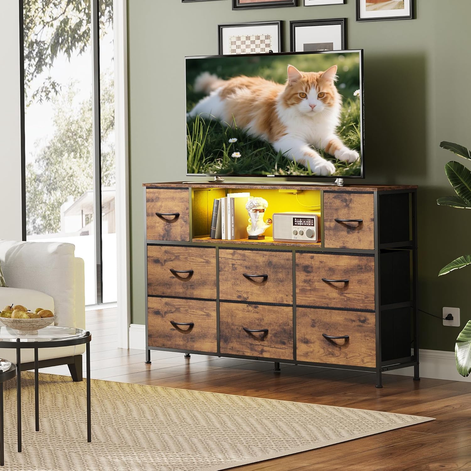 Eyesoul TV Stand for 45, 50, 55 inch TV, Entertainment Center with LED Lights & Charging Station, TV Media Console Table with 8 Fabric Drawers and Open Shelves for Living Room, Hallway, Rustic Brown
