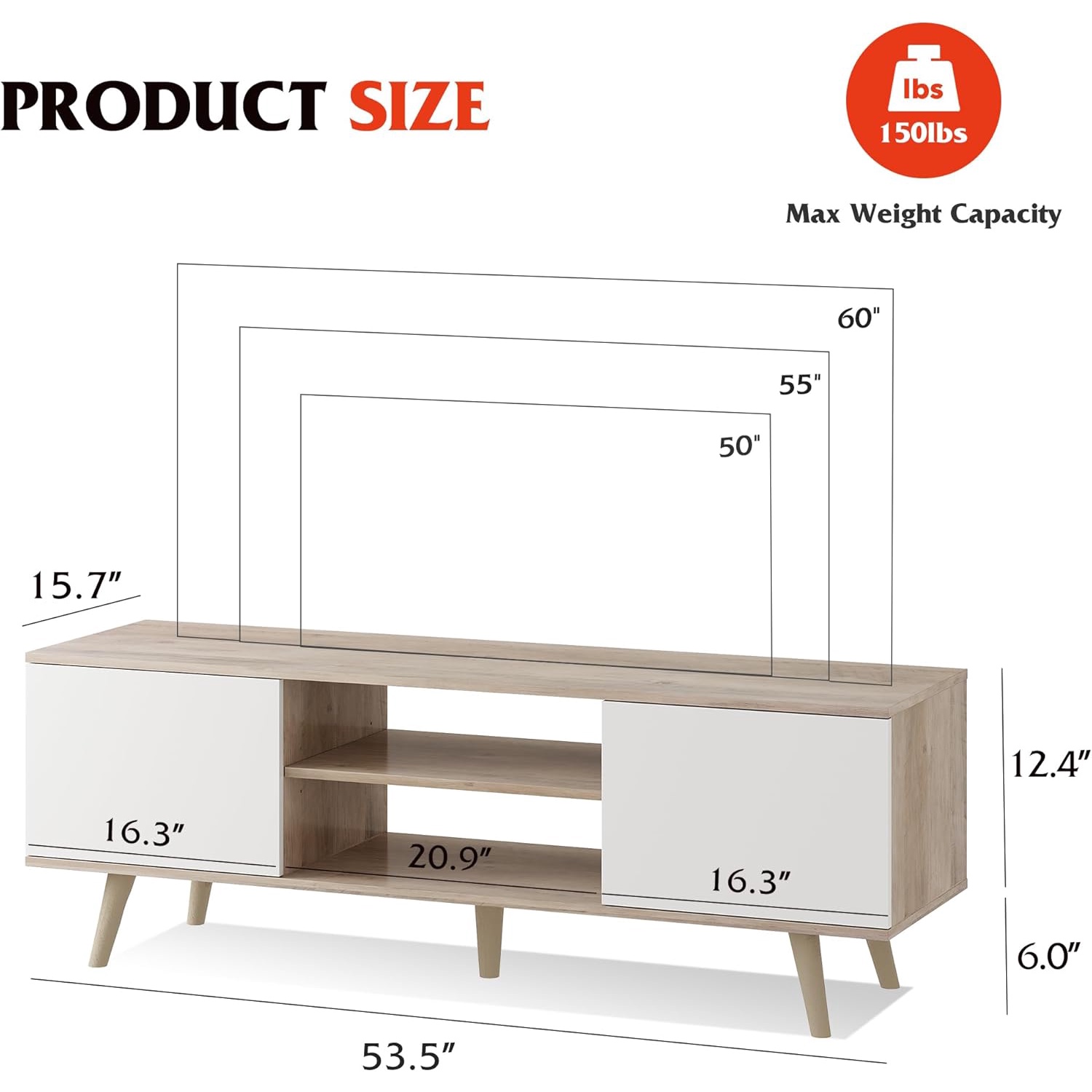 PROPER SIZEOverall dimension: 53.5"Lx15.7"Wx18.4"H. This TV stand is big enough to support 50, 55 and even 60 TVs, perfect choice for modern homes.
