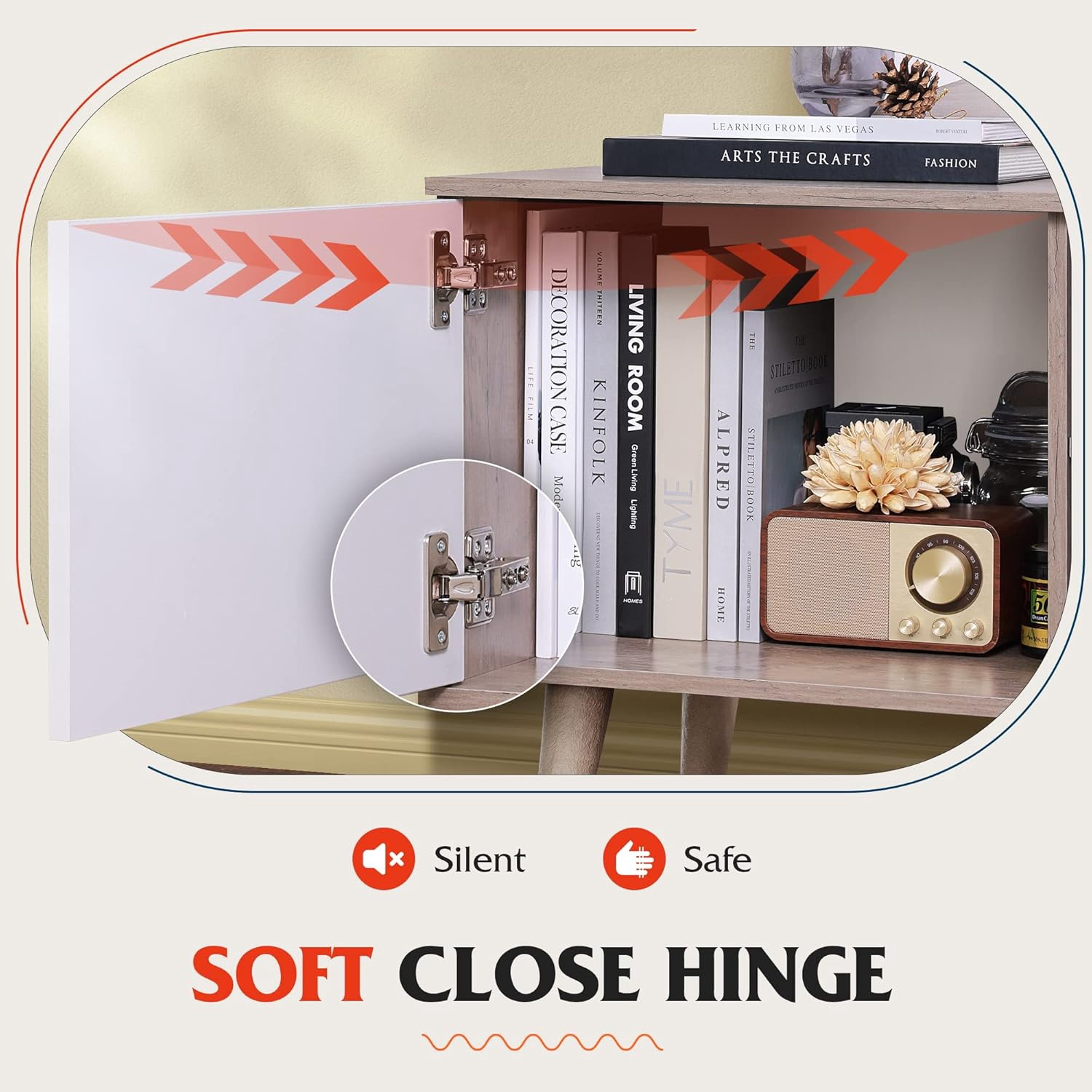 SOFT CLOSE DOOREquipped with soft-close hinge, this entertainment center is safe, don't need to worry about hurting your fingers, it only takes a gentle push to close the door without pinching hands or making noise.