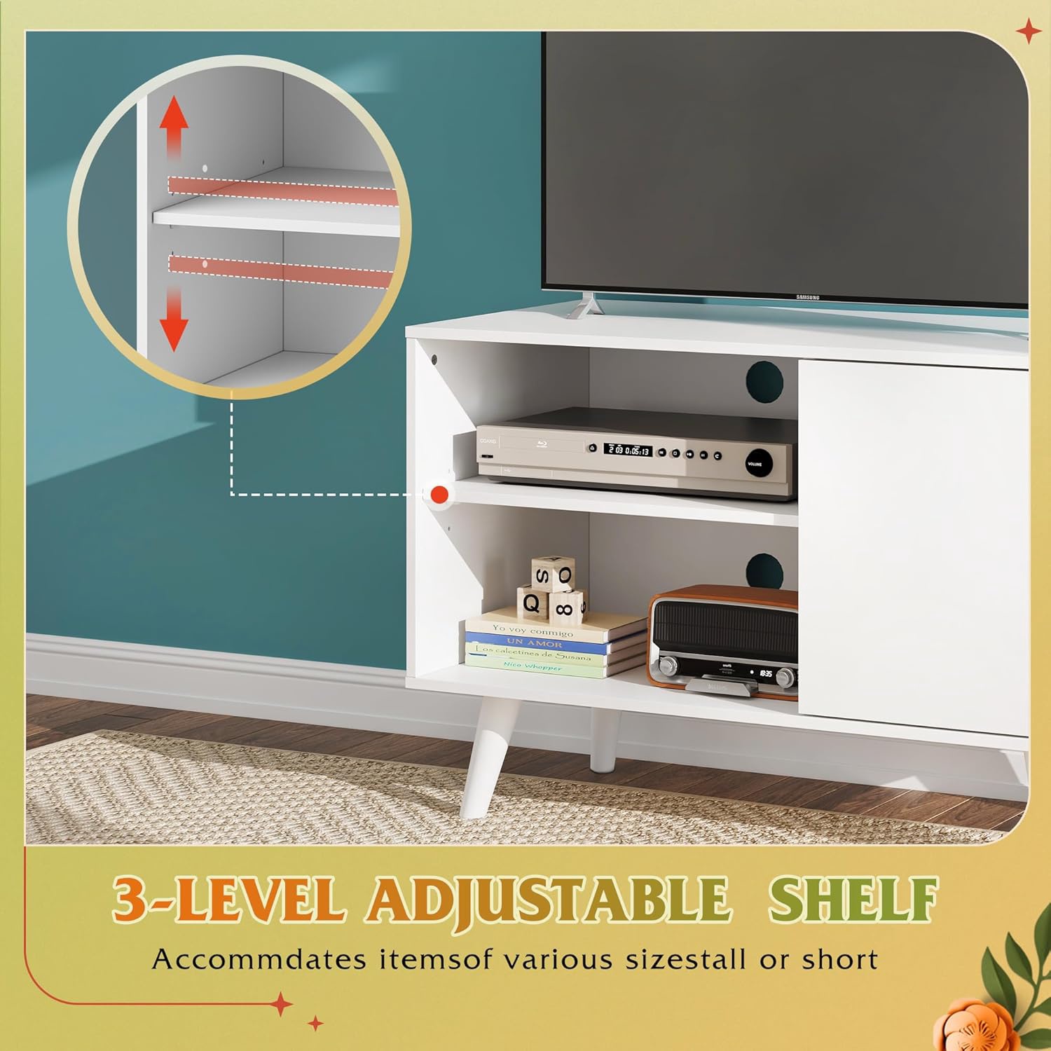 Space-Saving Serenity TV StandDesigned for studio apartments & 32/40/43 inch tv (31.7''W x 21.9''H x 15.7''D), this mid century modern tv stand features tapered legs and wood texture. The media console for corner and compact spaces, transforming unused areas into retro-elegant zones while infusing warmth into your living room or bedroom.