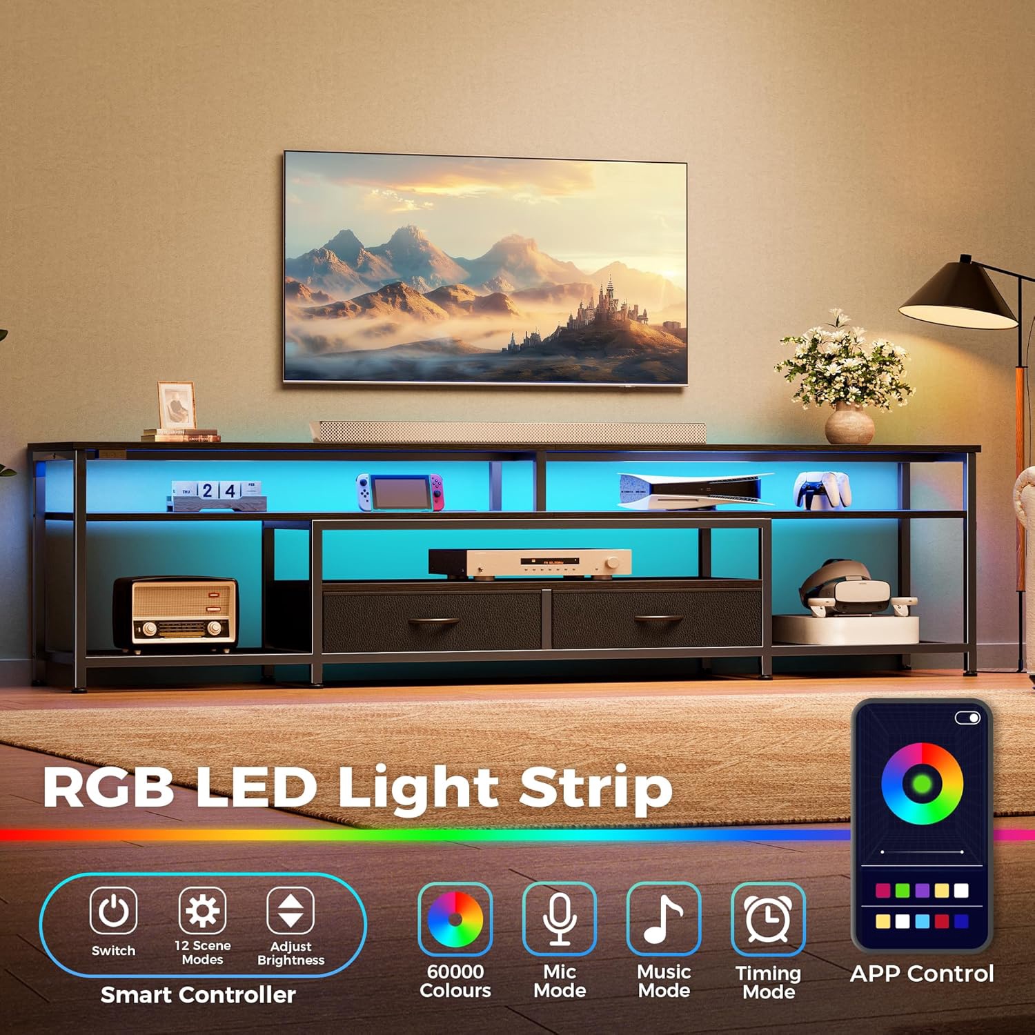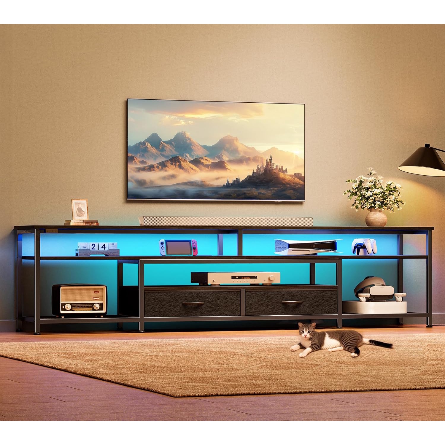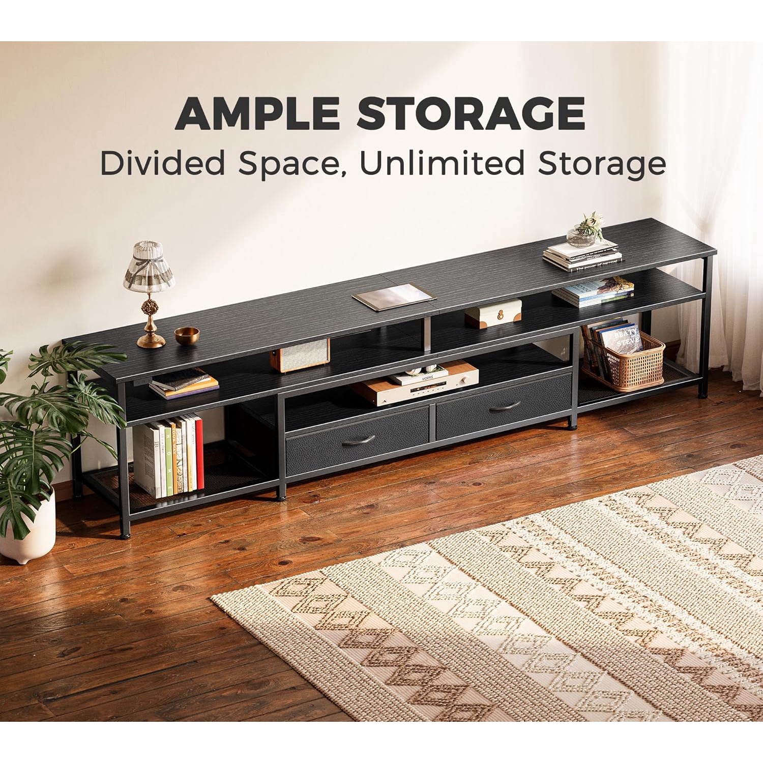 Storage from Shelves and DrawersOur black TV stand comes equipped with black PU leather fabric drawers, adding a touch of elegance. And 2 drawers are perfect for storing videotapes, books, chargers, remote controls while mesh and open shelves will arrange your gaming consoles, soundbars, cylindrical speakers, TV set-top boxes well