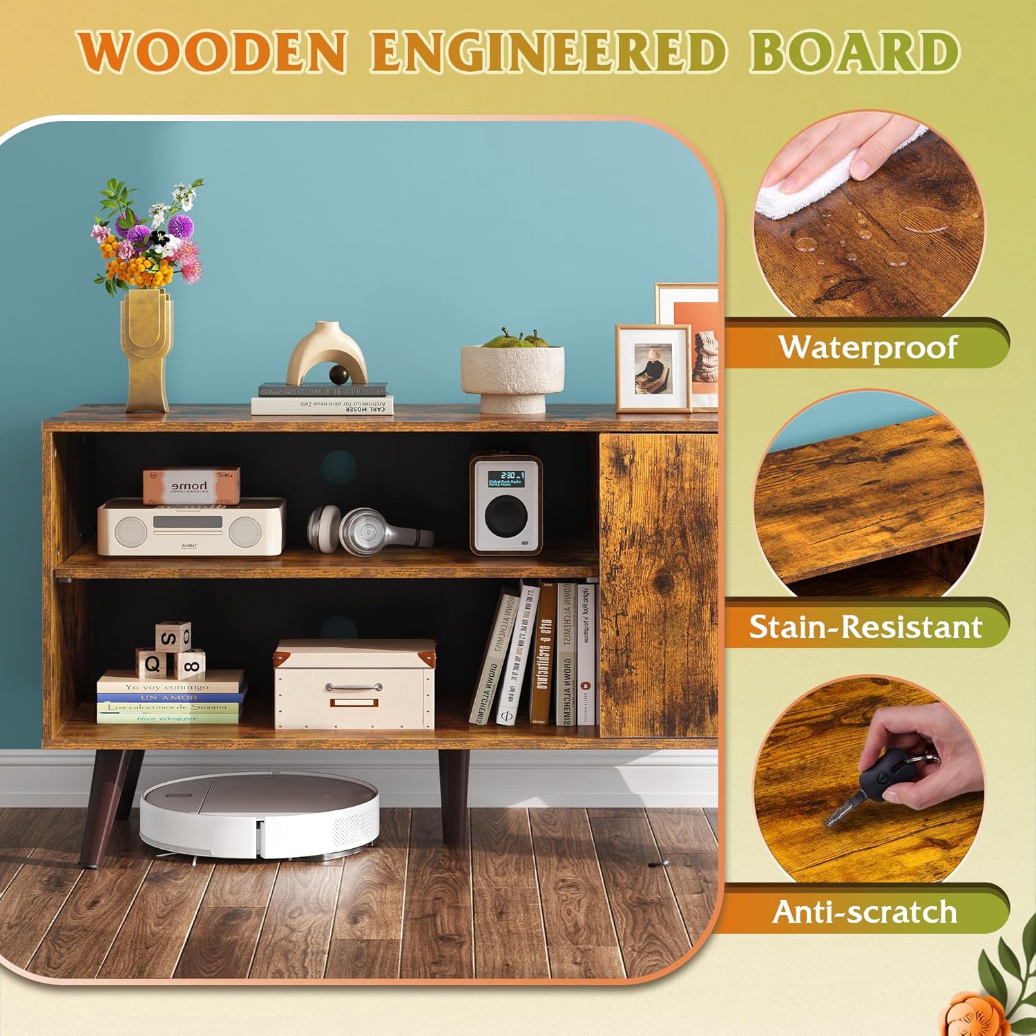 Selected Material & Durable StructureMade with delicate wood grain particleboard for sturdy structure, resistant to scratches and waterproof, without any smell. The top can bear a maximum load of 150 lbs. No shakes, no sagging holds large TVs and heavy essentials securely.