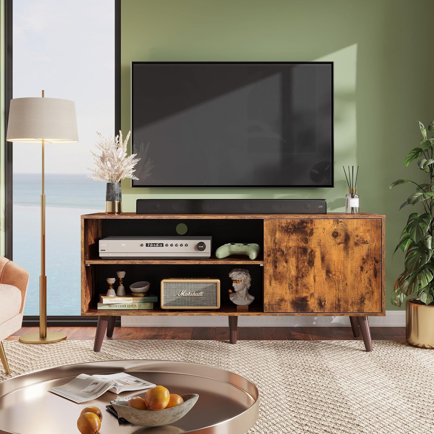 Mid Century Modern TV StandThis Mid Century Modern TV Stand for 55 inch TV measures 47.2"W x15.7"D x 21.8"H. Wood material and tapered angled legs improve the entertainment centre's retro style, creating a warm and inviting atmosphere to your home.