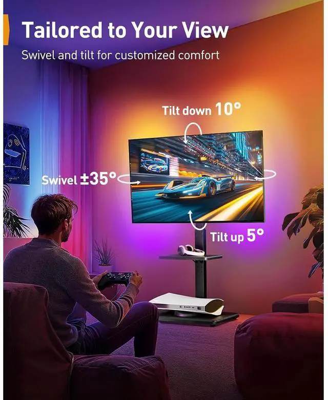 Floor TV Stand with LED Light: The TV floor stand features modern, adjustable RGB LED ambient lighting and immersive viewing. Control the lights via mobile app, remote, or wired switch, with customizable settings for 16 million colors, brightnesses, speeds, modes, and a timer. The lights sync with sound or rhythm, reducing visual fatigue and providing a comfortable backlight.