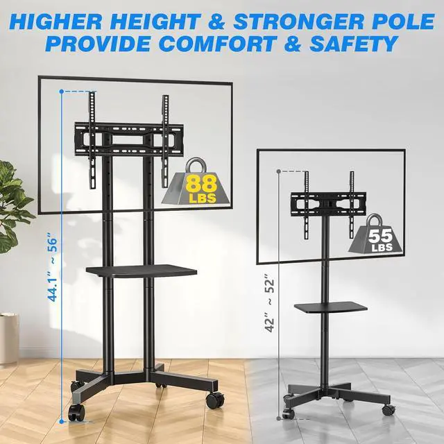 15-LEVEL HEIGHT ADJUSTABLE FOR EYE-LEVEL COMFORT: Our mobile TV cart for bedrooms can be adjusted from 44.1" to 56". It offers greater adjustability compared to other products (typically 42"-47"). The sturdy middle storage shelf with 22 lbs load capacity is also height-adjustable. Easily store laptops, DVD players, streaming media devices, and more at your preferred height. This system provides optimal viewing comfort while giving flexibility for TV placement.