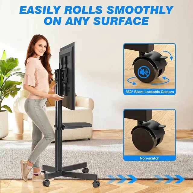 UPGRADED 360° ROTATING LOCKABLE WHEELS: Say goodbye to static TV! Our rolling TV stand includes 4 upgraded 360° rotating wheels. When moving the cart, you can wrap the power cord around the outlet instead of holding it while pushing. The wheels provide smooth gliding on both hardwood and carpet floors. Whether you're working in a home office, cooking in the kitchen, practicing yoga, or relaxing in the living room, our TV cart is a perfect fit.