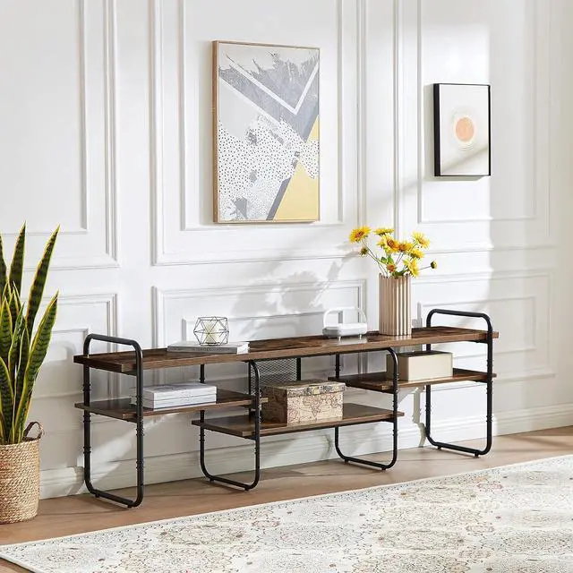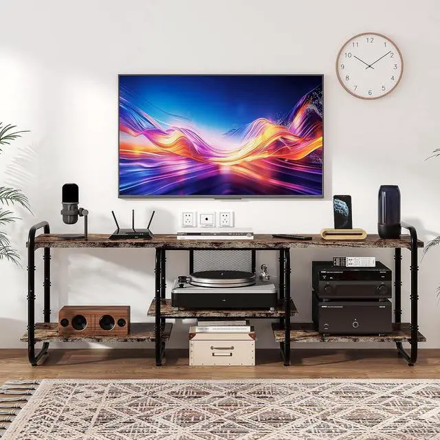 Sturdy & DurableConstructed with high-quality particleboard and a robust metal frame, this entertainment center offers exceptional stability. The top shelf supports up to 165 lbs, while each lower shelf holds 55 lbs, ensuring long-lasting reliability.