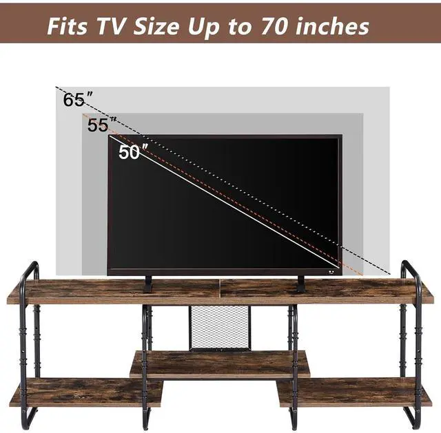 Rustic TV StandDesigned with a natural wood-grain finish and rustic metal frame, this rustic-style media console blends modern, industrial, retro, and farmhouse aesthetics. Dimensions: 63" (L) x 23.6" (H) x 15.7" (W) fits TVs up to 70 inches.