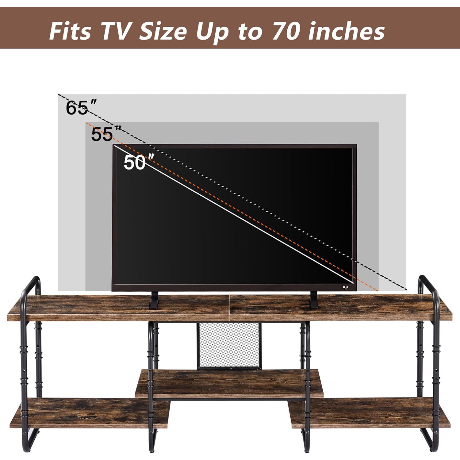 Rustic TV StandDesigned with a natural wood-grain finish and rustic metal frame, this rustic-style media console blends modern, industrial, retro, and farmhouse aesthetics. Dimensions: 63" (L) x 23.6" (H) x 15.7" (W) fits TVs up to 70 inches.