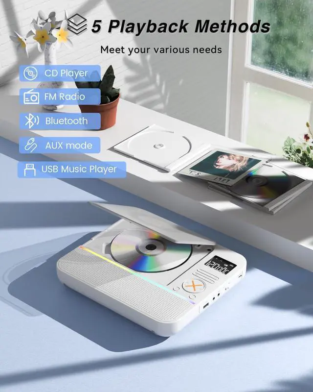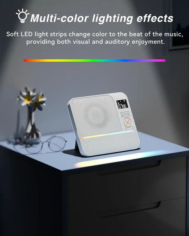 [CD Player Portable with Multi-Color Lighting] MONODEAL's CD player features a Bluetooth transmitter and receiver, allowing it to connect to phones, computers, and tablets while also transmitting audio to Bluetooth headphones and speakers. This CD player bluetooth incorporates modern lighting elements, offering a choice of three dynamic RGB lighting effects that change color to the beat, delivering both visual and auditory enjoyment. It's the perfect addition to your living room or bedroom.