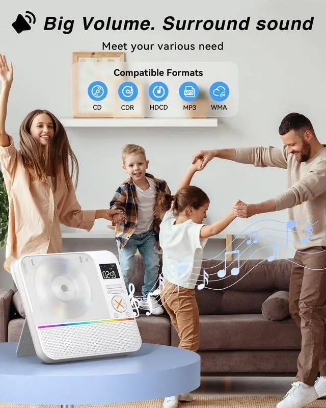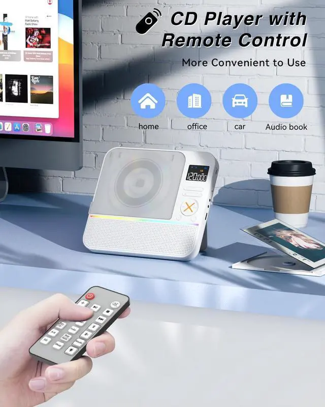 [4*HIFI Speakers & Remote Control] This portable CD player features four built-in speakers, providing surround sound throughout your living room. It also comes with a remote control with control within a 10-meter radius. It lets you control music, volume, and mode. Enjoy music from the comfort of your sofa. Perfect for audiobook lovers.Its easily tabletop design makes it a perfect addition to any living room or bedroom.