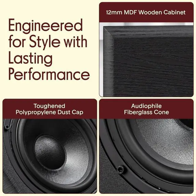 HIGH-QUALITY BUILT Made from top-quality 12mm MDF with a beautiful wood grain finish, these speakers provide durability and aesthetic appeal. The audiophile-grade painted paper woofer cone ensures an amazing sound experience