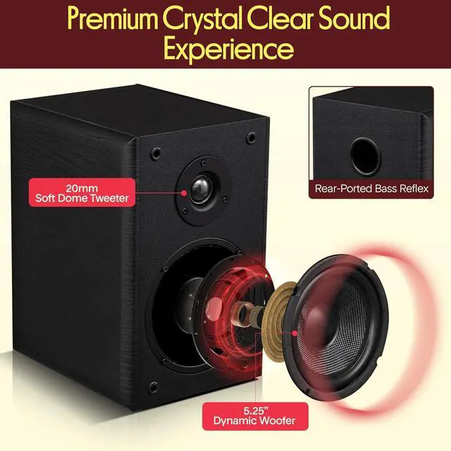 CRYSTAL CLEAR SOUND These bookshelf speakers deliver exceptional audio quality with a 25mm soft dome tweeter and a 5.25 dynamic woofer, offering clear highs and deep lows. Enjoy realistic, crisp sound with these 2-way home audio speakers