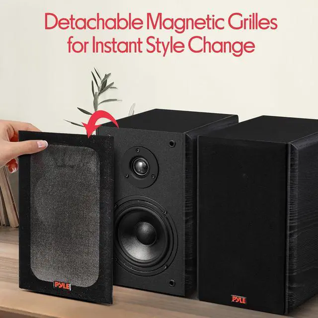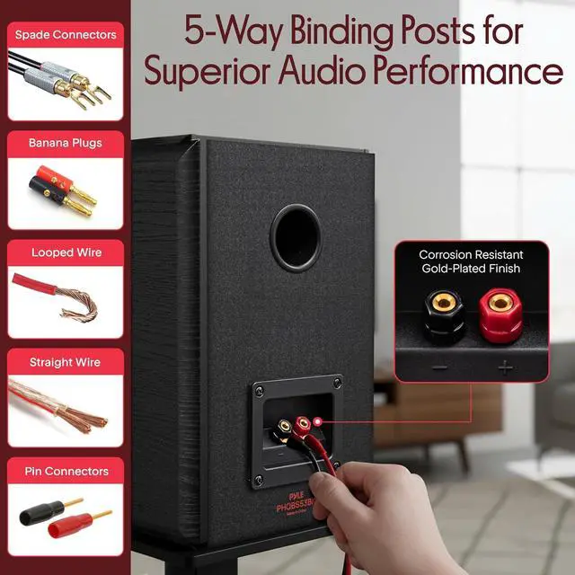 EASY CONNECTION AND SETUP With gold-plated 5-way binding post terminals, these wired bookshelf speakers are compatible with banana plugs, bare wire, and spade terminals. The detachable magnetic grill adds a sleek look and ensures easy installation