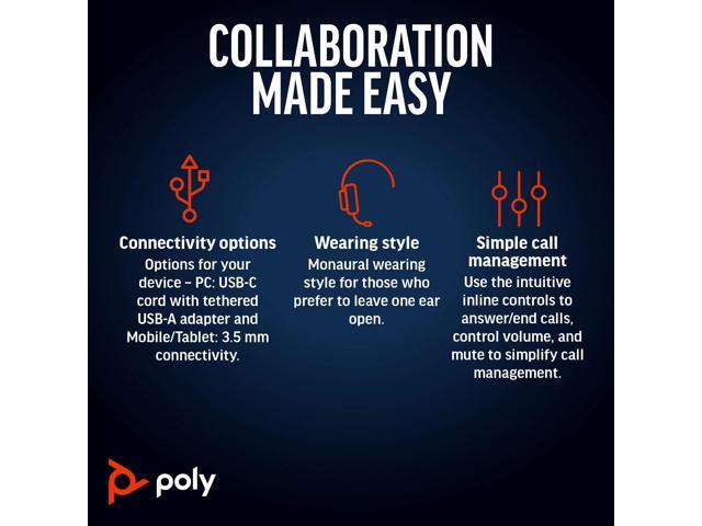 - Connectivity options - Enhanced connectivity for your devices: USB-C cord with tethered USB-A adapter for PC and 3.5 mm for mobile or tablet connectivity.. Comfort and durability - Ultra-soft leatherette ear cushion(s) wrapped around pillow-soft memory foam provide long lasting comfort. A lightweight cushioned metal headband offers durability and a comfortable custom fit.. Wearing style - Premium PC wideband audio with noise-cancelling microphone and Digital Signal Processing (DSP) for a more natural voice sound.. Simple call management - Use the intuitive inline controls to answer/end calls, control volume, and mute to simplify call management. Conveniently placed indicator lights provide helpful but unobtrusive user call, mute, and volume status.. SoundGuard Digital technology provides advance audio protection - Premium PC wideband audio with noise-canceling microphone and Digital Signal Processing (DSP) for a more natural voice sound.