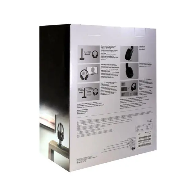 In the box: WHRF400R Headphones, TMRRF400 Transmitter, AC Adaptor, Stereo Mini Cable, RCA Plugs Adaptor, Rechargeable Battery