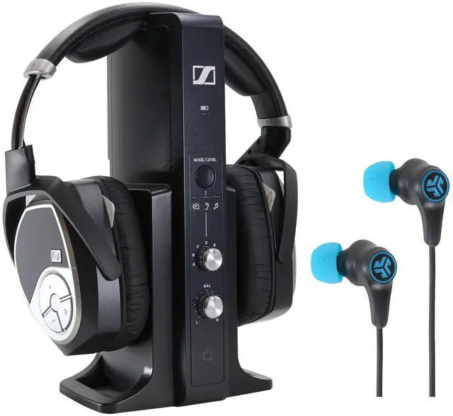 SENNHEISER RS 195 DIGITAL WIRELESS HEADPHONE SYSTEM FOR TV LISTENING + JLAB PLAY GAMING WIRELESS BLUETOOTH EARBUDS - BLACK/BLUE