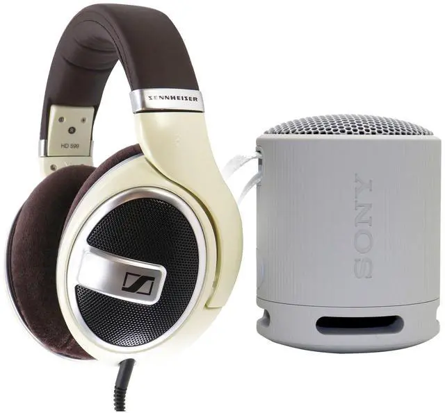 SENNHEISER OPEN-BACK OVER-EAR HEADPHONES (MATTE IVORY) - HD-599 + SONY XB100 PORTABLE WATERPROOF BLUETOOTH SPEAKER (GRAY) Sennheiser HD-599 Around-Ear Headphones (Matte Ivory) The matte ivory HD-599 Open-Back Around-Ear Headphones from Sennheiser are a successor to the popular HD 500 series and are powered by Sennheiser's proprietary transducer technology and Ergonomic Acoustic Refinement (EAR) design, which channels the audio signal directly into your ears. They can be used to deliver high-end audio performance and offer exceptional wearing comfort, thanks to the large earcups, broad-padded headband, and soft replaceable earpads.