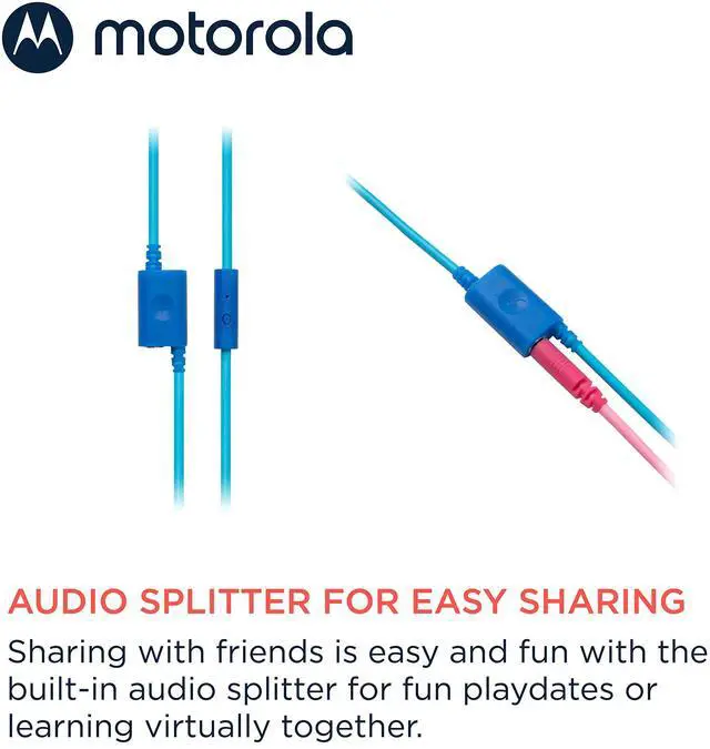 The Motorola Sound MOTO JR200 children's headphones therefore have a special volume limit. This means that the wired headphones for kids must not be louder than 85 dB. This is the maximum recommended by the WHO. Listening to music with friends Listening to music, children's programs and audio books together is of course much more fun than being alone. The MOTO JR200 wired headphones therefore come with an audio splitter to which you can connect up to 2 headphones at the same time. So your child can share their favorite music, films and series with their friends and even with mom and dad.