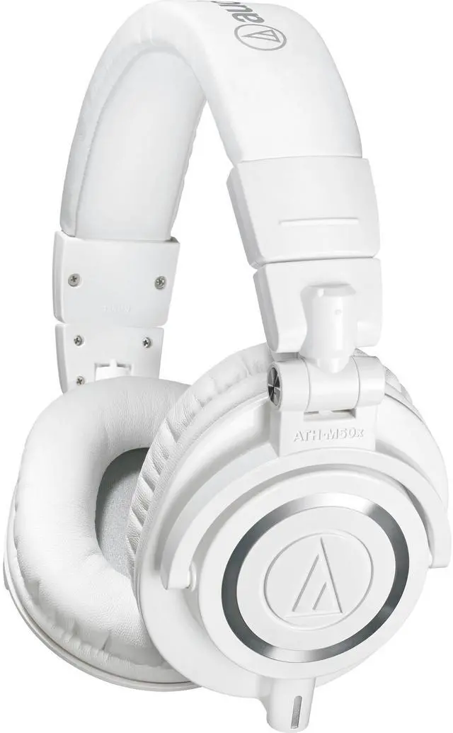 The white ATH-M50x Monitor Headphones from Audio Technica are designed for use in critical studio mixing and tracking as well as for DJ monitoring applications. They feature 45mm Neodymium drivers with copper-clad aluminum voice coils that provide an extended frequency response from 15Hz to 28kHz. The headphones have a circumaural, around-the-ear design that provides sound isolation in loud environments. The ATH-M50x's ear cups can be swiveled 90-degrees, allowing for single-ear monitoring. The headphones have a detachable single-sided cable system, and a 3-meter coiled cable, a 3-meter straight cable, and a 1.2-meter straight cable are included. When not in use, the ATH-M50x can be folded down and stored in the included carry pouch.