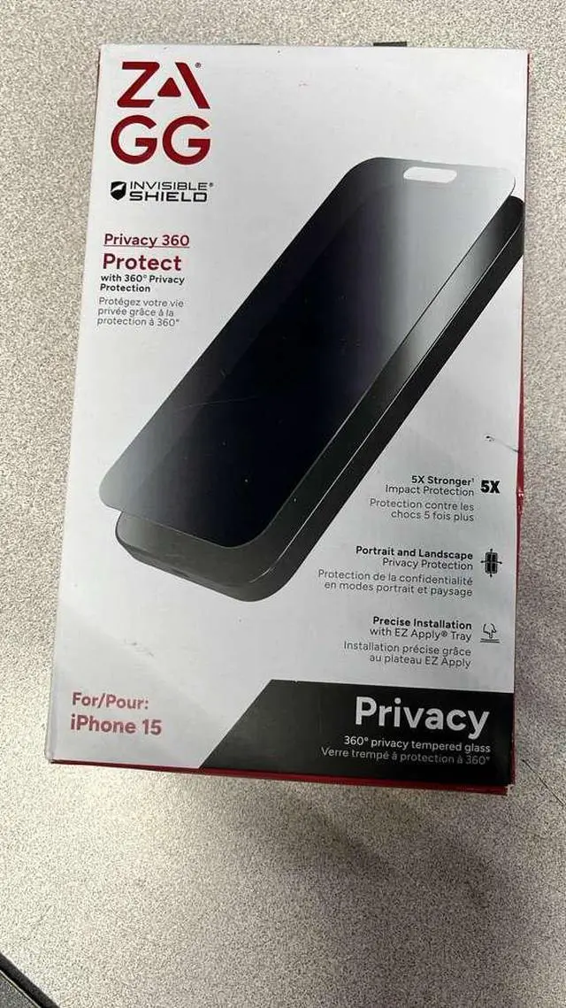 The ZAGG InvisibleShield Privacy 360 Protect Screen Protector for iPhone 15 is a premium fullcoverage tempered glass protector engineered with ultrastrong aluminosilicate glass to provide enhanced impact and scratch resistance while incorporating a 360° fourway privacy filter that limits viewing angles so only the person directly in front of the screen can clearly see content, and it also includes ClearPrint surface treatment to reduce visible fingerprints, an antimicrobial coating to inhibit bacterial growth on the protectors surface, reinforced edges to help prevent chipping, and an EZ Apply® installation tray with antidust adhesive for accurate, bubblefree alignment while maintaining smooth touch sensitivity and optical clarity of the original display.