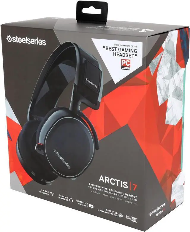 Arctis 7 Gaming Headset features lag-free wireless audio, 15-hour battery life, Game/Chat balance, and DTS Headphone:X 7.1 Surround. Compatible with PC, Mac, Xbox, PlayStation, Mobile, and VR.
