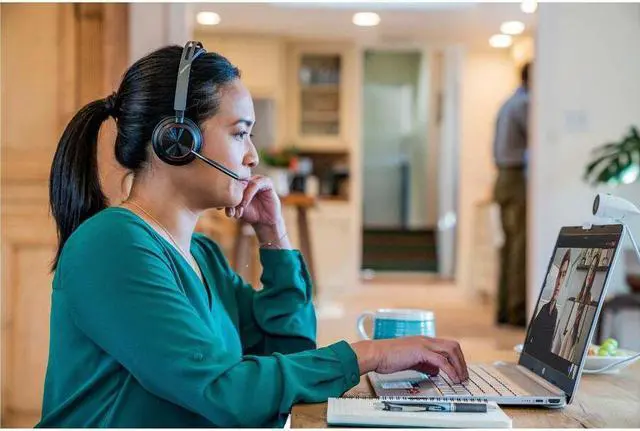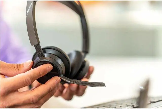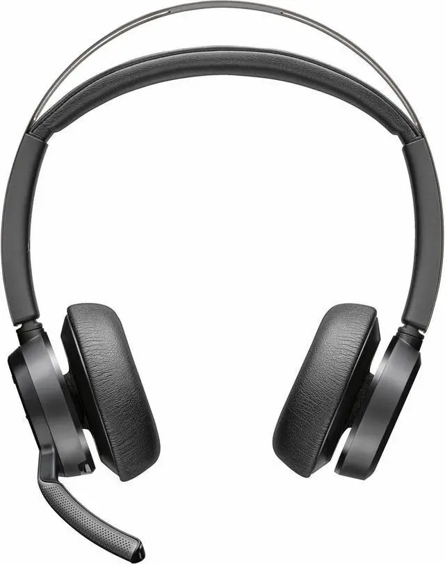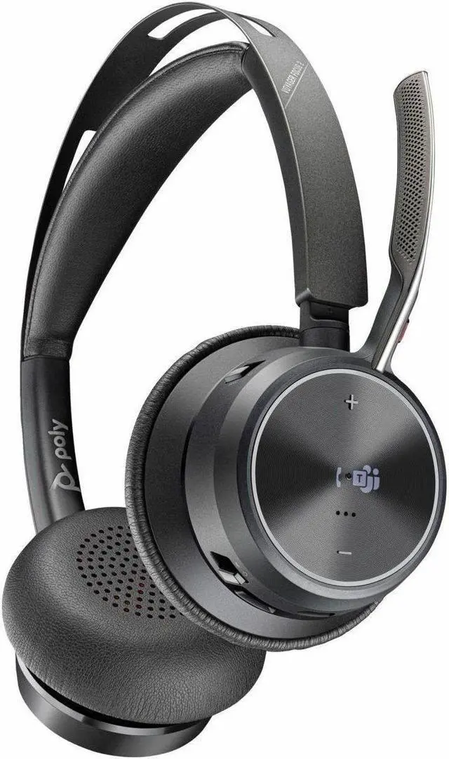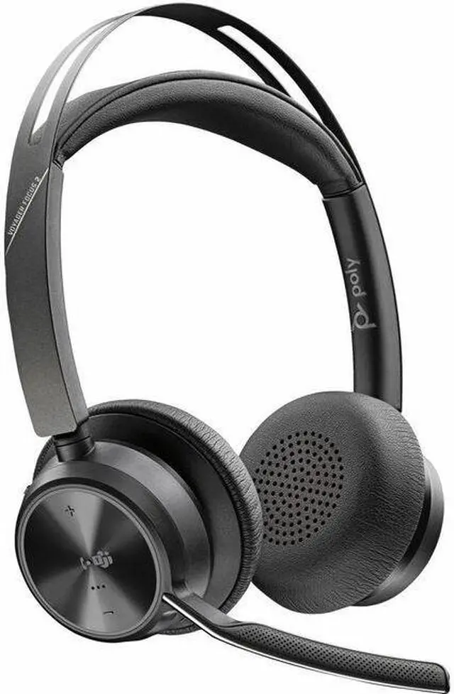 STEREO BLUETOOTH (r) HEADSET | BENEFITS Stay comfortable during a full day of calls wearing an ultra-comfortable headband with sling and plush ear cushions. Enjoy the simplicity of an easy-touse headset with smart sensors for answering calls, pausing music and instantly muting calls. Give those around you a visual cue that you're busy-an online ear cup indicator flashes when you're on a call. It just works-the smart microphone boom automatically maintains left and right audio no matter which side the headset is worn. VOYAGER FOCUS 2We couldn't build a wall around you to block out background noise, so we did the next best thing: created a "focus zone" with the new Voyager Focus 2 headset. All you hear is your call with three levels of hybrid active noise canceling (ANC). All they hear is you with our pro-grade microphones using Poly Acoustic Fence technology. And while you're thinking about your call, it's thinking for