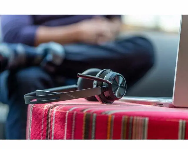 The Voyager Focus 2 is designed with you in mind - stay focused and productive all day. Crystal clear conversations It's you - loud and clear. That's all callers hear. The discreet microphone boom is not only ultra-noise canceling but, with its Acoustic Fence technology, literally creates a virtual noise-free bubble in front of your mouth. Feature | Immersive experienceStay focused while on calls or listening to music/media with stereo sound. Easy to use An easy-to-use headset with smart sensors for answering/muting calls and playing/pausing music. The intelligent microphone boom automatically maintains left and right audio no matter which side the headset is worn on.