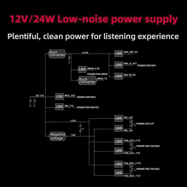 The K7 features a power design consisting of multiple independent stages, with a voltage of each stage being regulated by low-noise LDOs. Feeding this power design is an external 12V switching power supply