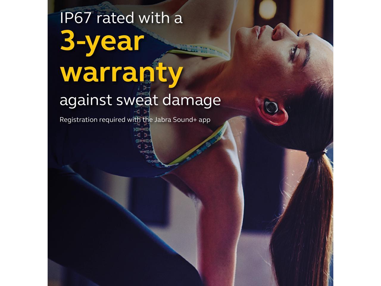 Guaranteed durability. IP67-rated waterproof design, with 3-year warranty against sweat damage (Registration required via Jabra Sport Life App).