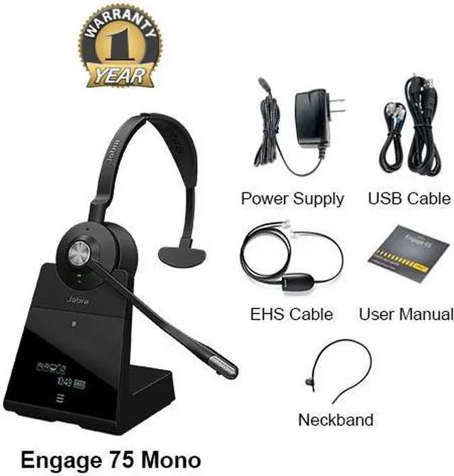Jabra Engage 75 Mono # 9556-583-125 with EHS Polycom 14201-17 The Jabra Engage 75 Mono is a professional entry-level wireless headset designed for use with PC-based telephony such as Skype. The Jabra Engage 75 Mono offers enhanced speakers that deliver crystal-clear calls even in noisy offices. The advanced noise-cancelling microphone eliminates unwanted background noise. The Jabra Engage 75 Mono lets you connect with desk phone, softphone, analog phones and two Bluetooth devices. The speaker software separates noise from speech, reducing user stress. All incoming calls can be adjusted to a user-defined sound level that stays constant for all day comfort.