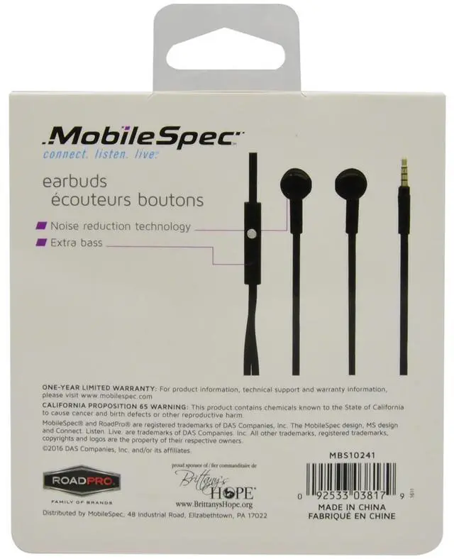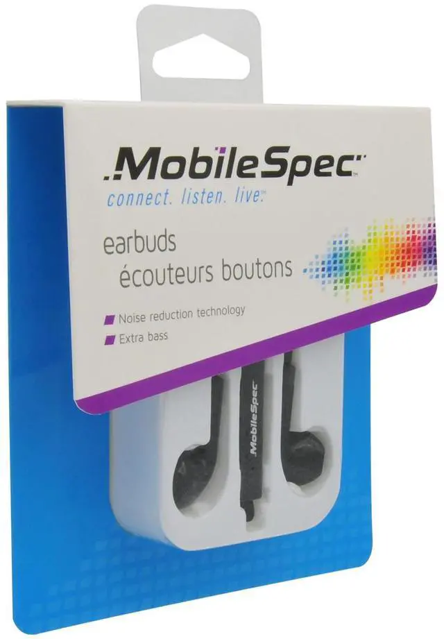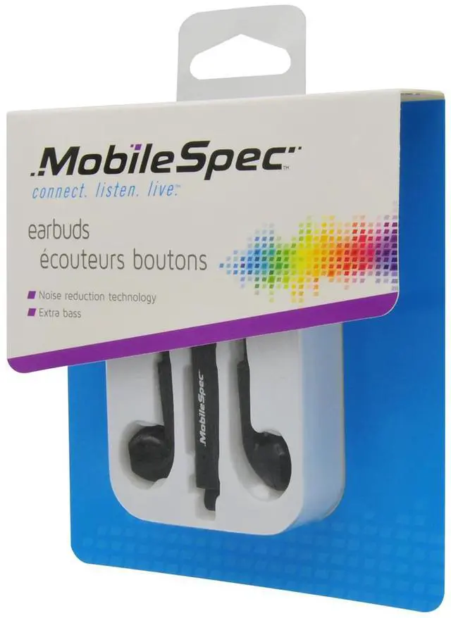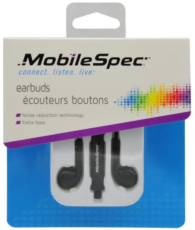 MobileSpec MBS10241Brand NewIncludes One Year WarrantyIn-Ear Style BudsTangle Free Flat CordNoise Reduction TechnologyExtra BassIn-Line Microphone Seamlessly Switch between Music and Hands-Free Talking