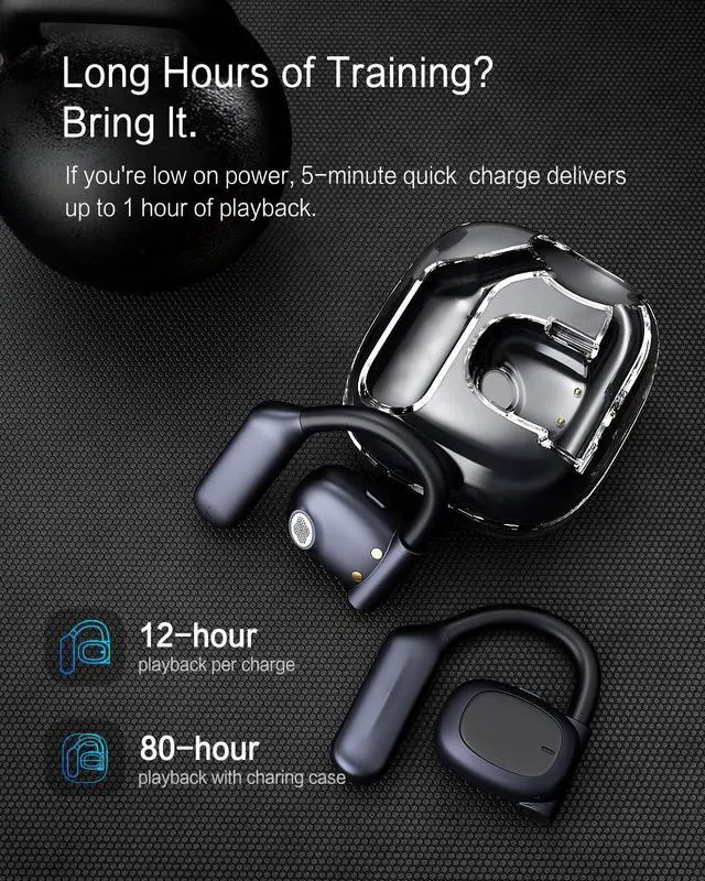 [(A Week without Charging)] Both the ear hook earbuds and the charging case are equipped with large batteries. The power of a single open air earbud is 80mAh, which can be used for 12-14 hours. With the charging box ensuring 80-hour continuous use