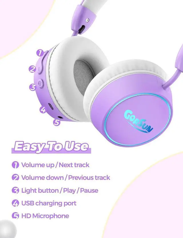 gorsun Kids Bluetooth Headphones, 85dB Volume Limited, 68 Hours Playtime, Bluetooth 5.4, Colorful LED Lights Kids Headphones Wireless with Microphone, Headset Birthday Gift for 1-13 Year Olds
