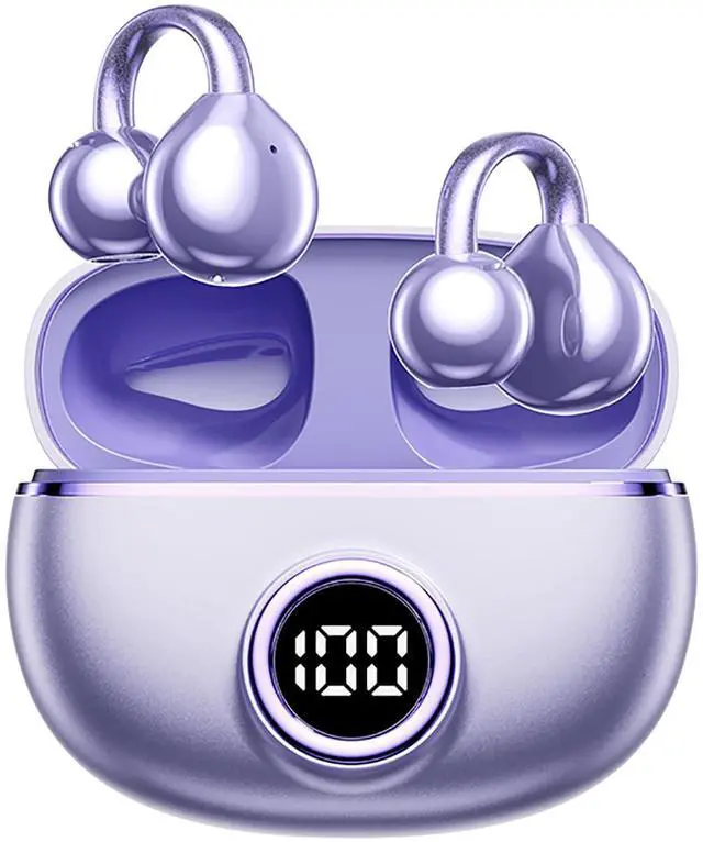 QJF Clip on Earbuds, Open Ear Wireless Bluetooth 5.4 Air Conduction Headphones with Mic, Waterproof, Sports Ear Buds, Comfortable for Small Ears, Glasses Wearers, Workouts (Purple)