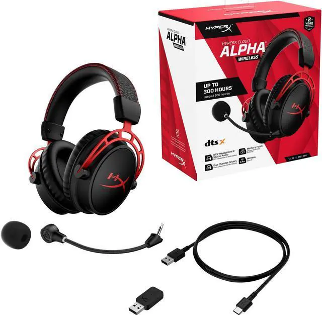 Included Items HyperX Cloud Alpha Wireless DTS Headphone:X Gaming Headset for PC PS5 and PS4 USB Charging Cable (0.5M) Pop Filter Detachable mic USB wireless adapter Quick Start Guide Features Up to 300 Hours of Battery Life² Play knowing youll get weeks of gaming out of a single charge. The fast 2.4GHz connection provides wireless freedom without sacrificing audio quality.