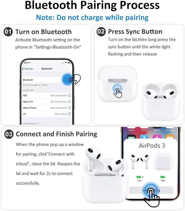 HOW TO BLUETOOTH PAIR WITH THE WIRELESS CHARGING CASE: Simply turn on Bluetooth and insert your headphones into the charging case, keeping the lid open. Press and hold the button for more than a second. When the indicator light blinks, release the button to enter pairing mode. When you see a pop-up window that says "Your Airpods 3", click Connect. Once connected, tap the button again to exit pairing mode and Bluetooth pairing is successful.