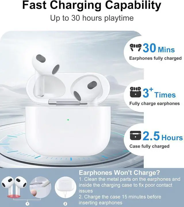 QUICK CHARGING CASE FOR HEADPHONES: Replacement wireless charging case supports airpod 3 charging technology for fast charging in 15-20 minutes. You can listen to up to 3 hours of music in just 15-20 minutes of charging time. The replacement wireless charging case is perfectly compatible with Airpods 3rd headphones. Never worry about your charging case running low again.