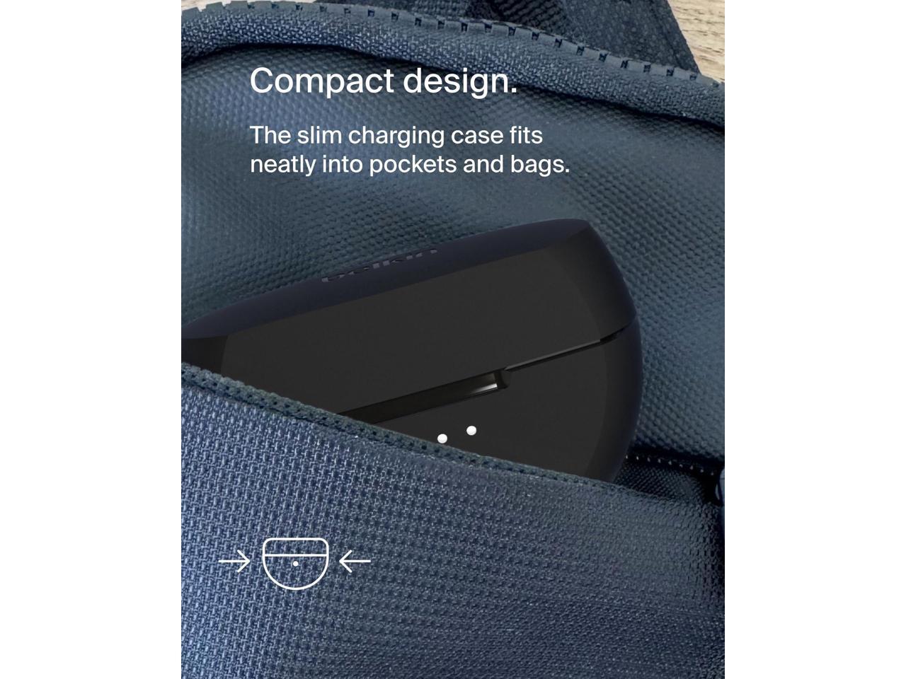 - Small, compact design with slim charging case easily fits in pockets and bags