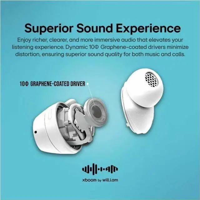 xboom by will. i. amElevate your listening experience to new heights with audio crafted by multi-platinum artist and tech pioneer, will. i. am. Tuned to perfectionEnjoy our most dynamic listening experience yet with sound that's vibrant and immersive. Bring the boom like never before with audio tuned to perfection by LG's Experiential Architect, will. i. am. Superior sound experience with graphene-coated driversEnjoy richer, clearer, and more immersive audio that elevates your listening experience. Dynamic 10Φ Graphene-coated drivers minimize distortion, ensuring superior sound quality for both music and calls.