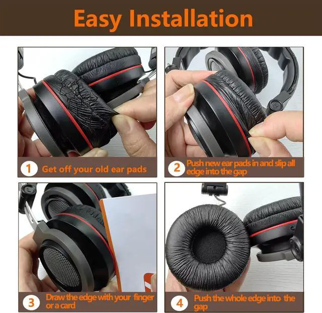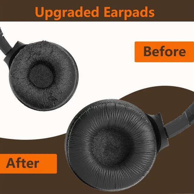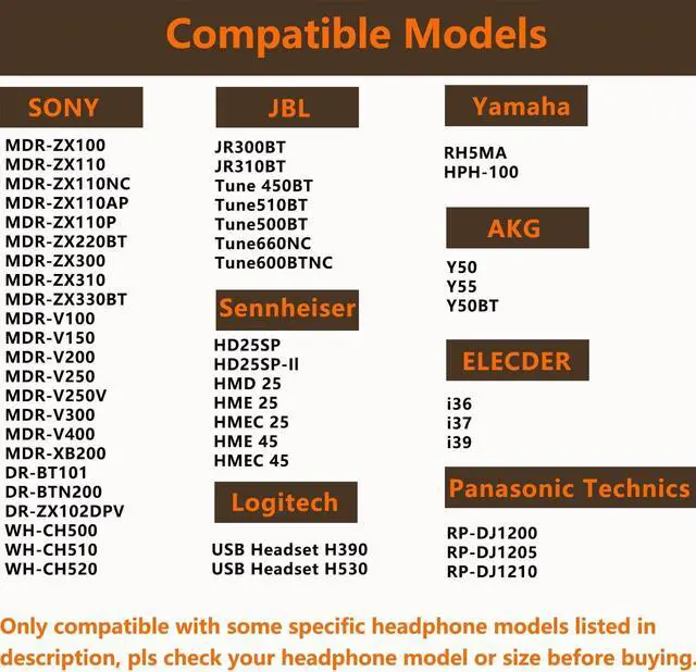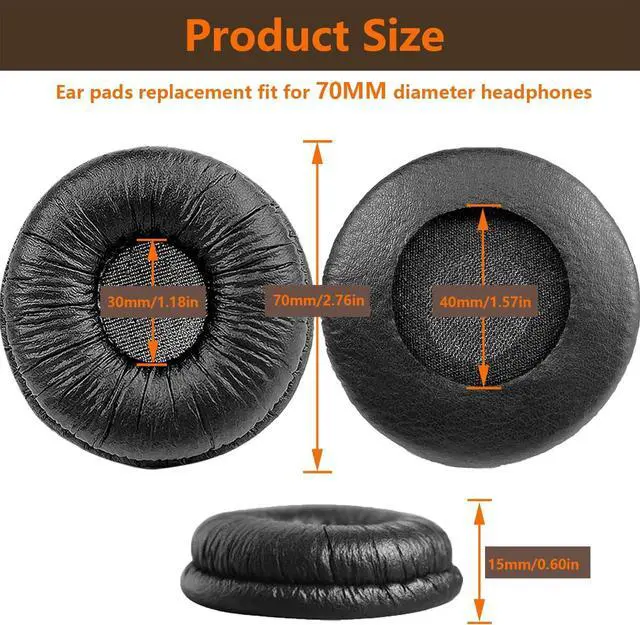 Compatible HeadphonesThese ear cushions replacement are compatible with but not limited to these headphone models: Sony MDR-ZX100 ZX110 ZX110NC ZX110AP ZX110P ZX220BT ZX300 ZX310 ZX330BT V100 V150 V200 V250 V250V V300 V400 DR-BT101 BTN200 WH-CH500 CH510 CH520 JBL Tune 450BT 510BT 500BT 660NC 600BTNC Sennheiser Logitech Yamaha AKG ELECDER Panasonic Technics etc. For other headphones please contact us for Compatibility Guide. Earpads Dimensions70mm/ 2.76 inches (overall diameter) 40mm/ 1.57 inches (mounting diameter) 15mm/ 0.60 inch (thickness). The ear pads fit for Most Standard Size Headphones perfectly with the same specification. Please note our earpads size and your headphone size before buying. Super Soft and DurableThe ear pads have been carefully selected and made of PU leather and high-quality memory sponge which are skin friendly breathable absorbable and crack resistant improving the comfort and durability of the ear pads. Easy to InstallNo skills needed these ear cushions can complete the entire installation in a few minutes replacing unsanitary worn or unusable ear pads. Please watch a detailed step-by-step video to guide you in replacing and refreshing worn ear pads. Sound Insulating & WarrantyOur well-made ear cushions are ergonomically designed to perfectly fit the shape of the ear without affecting the sound quality of the headphones isolating noise.